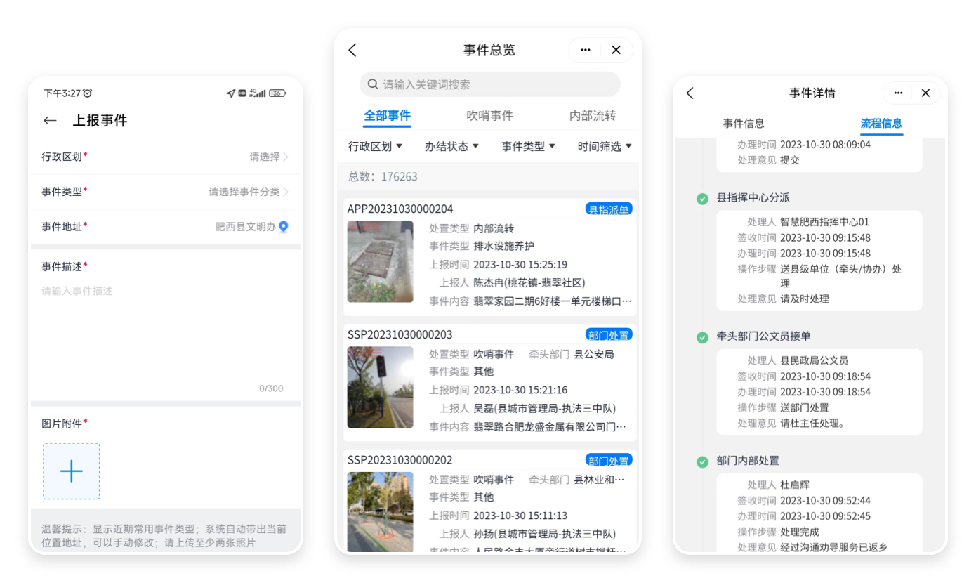 中期:對事件進展進行全局性跟蹤,建立節點可視化展示平臺。在每個事件的詳情中可查看每個節點辦理進度和詳情,對事件流轉的各個階段實現可視化。建立審核機制,由內部后臺、到縣指揮中心、再到多級部門,層層過關的審核機制確保問題反饋的暢通和事件處理的妥當。建立超期預警機制。對每個事件設置辦結時間,系統自動短信通知即將逾期的責任人,督促辦理或者申請延期,確保事件落實辦結。針對平臺上報的難以解決的問題,縣委不定期召開專題調度會,及時幫助解決事件歸屬、協調、責任等方面存在的問題,為事件落實辦結保駕護航。